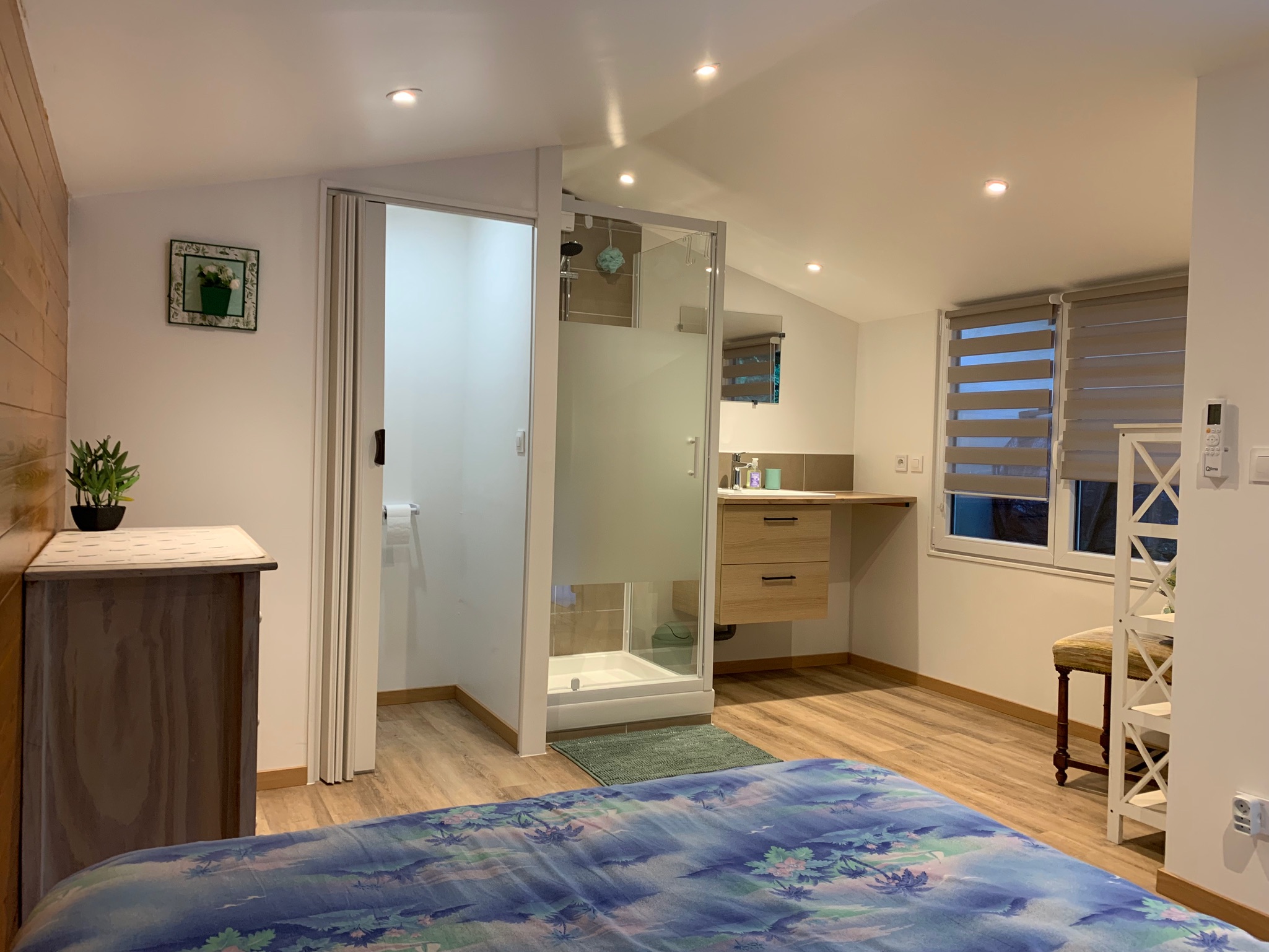 - Tweepersoonsbed (140 m x 190 m) met douche en lavabo