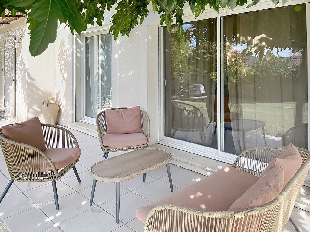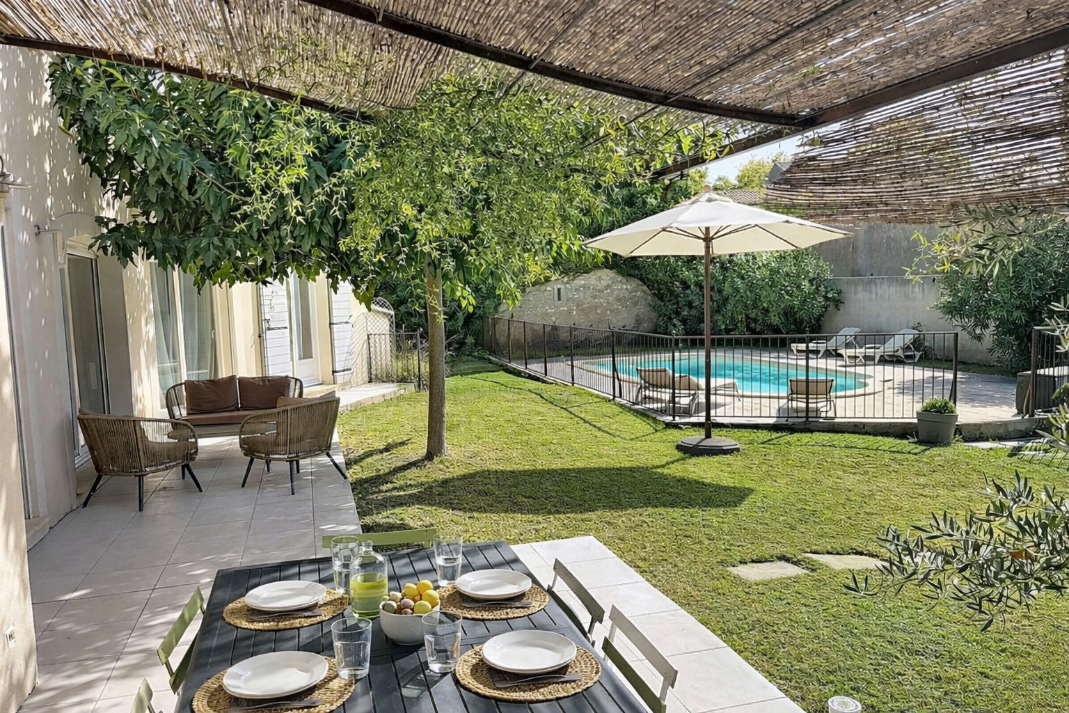 - Schaduwrijk pergola terras voorzien van tuintafel en tuinstoelen