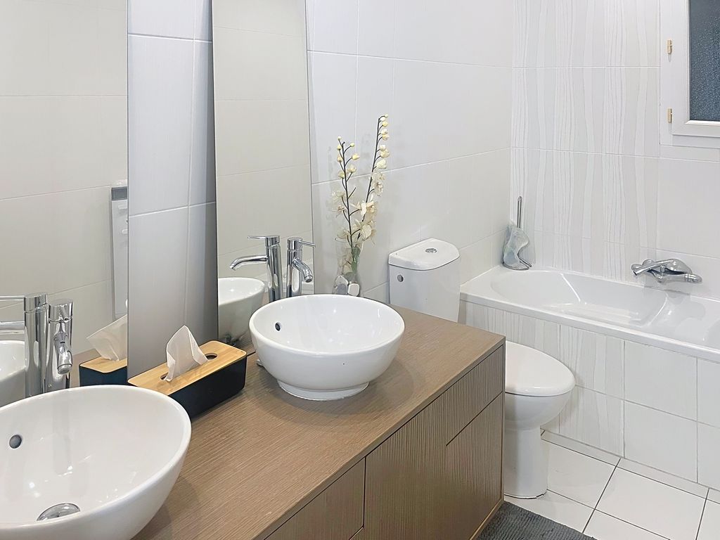 - Badkamer 1: dubbele lavabo, douche, bad en toilet