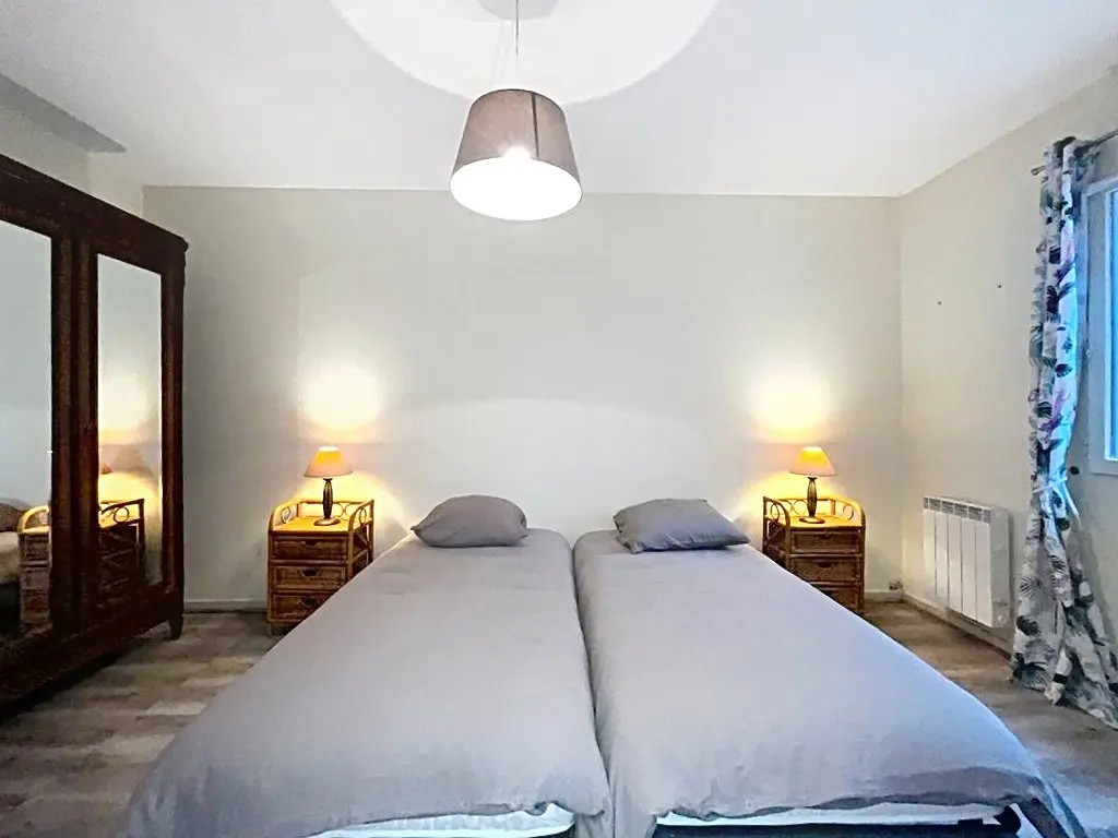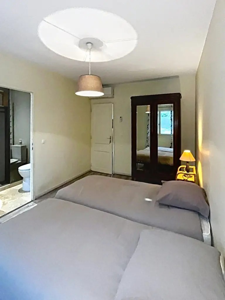 - Slaapkamer 1: twee eenpersoonsbedden van 90 cm, airco, met aansluitende doucheruimte met lavabo, douche en toilet.