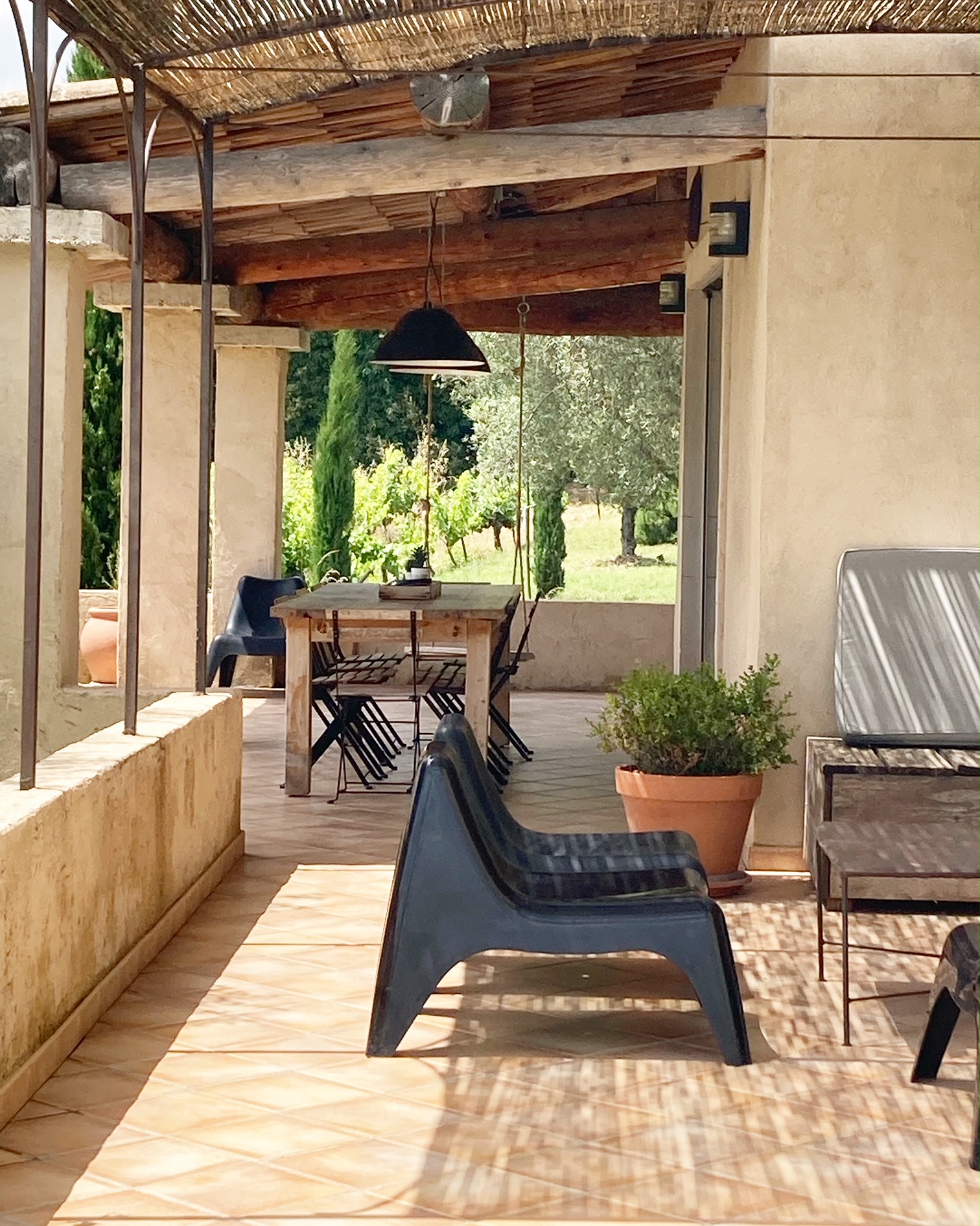 - Verschillende overdekte terrassen rondom de villa met stoelen en tafels