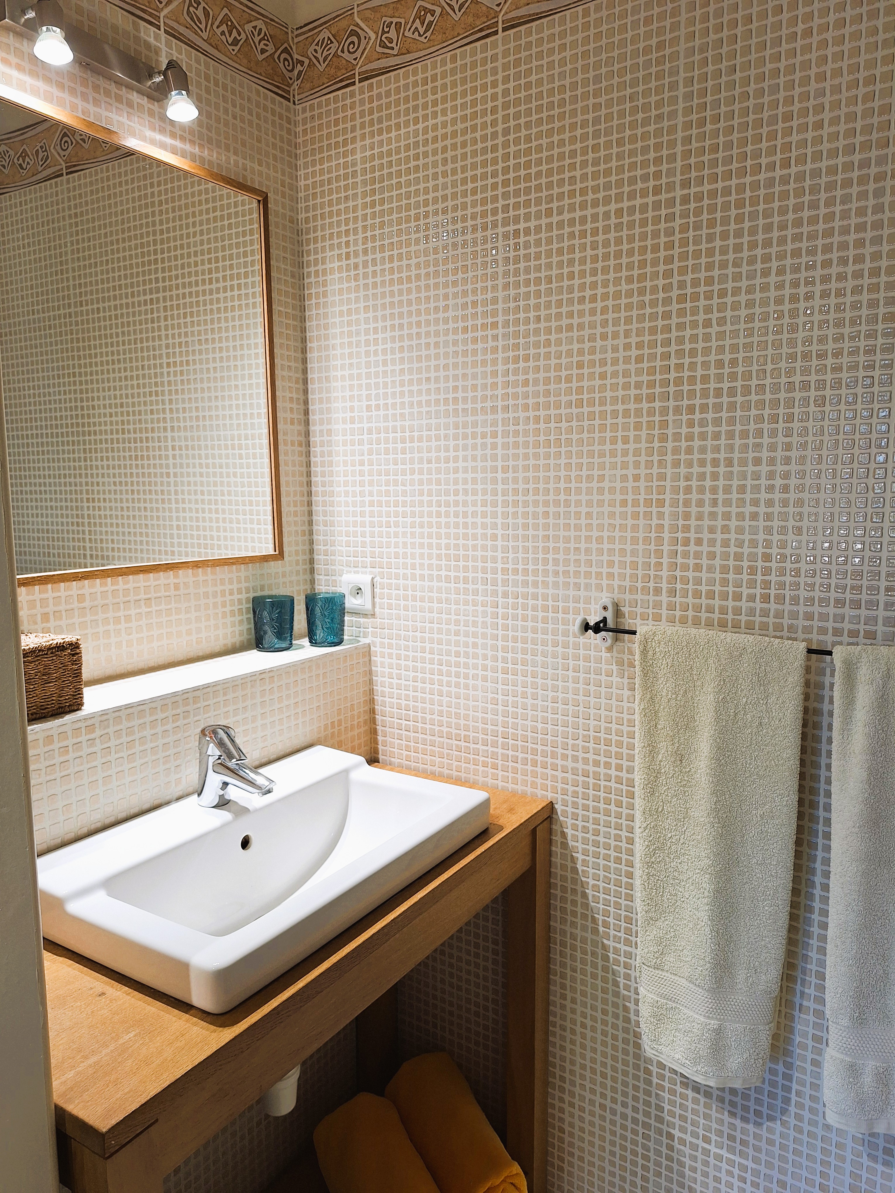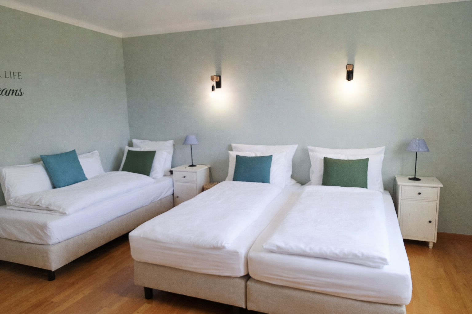 - Slaapkamer 3: drie eenpersoonsbedden (90x210 cm) waarvan twee samenvoegbaar tot een tweepersoonsbed (180 × 210 cm) met aansluitende badkamer voorzien van lavabo, bad/douche en toilet