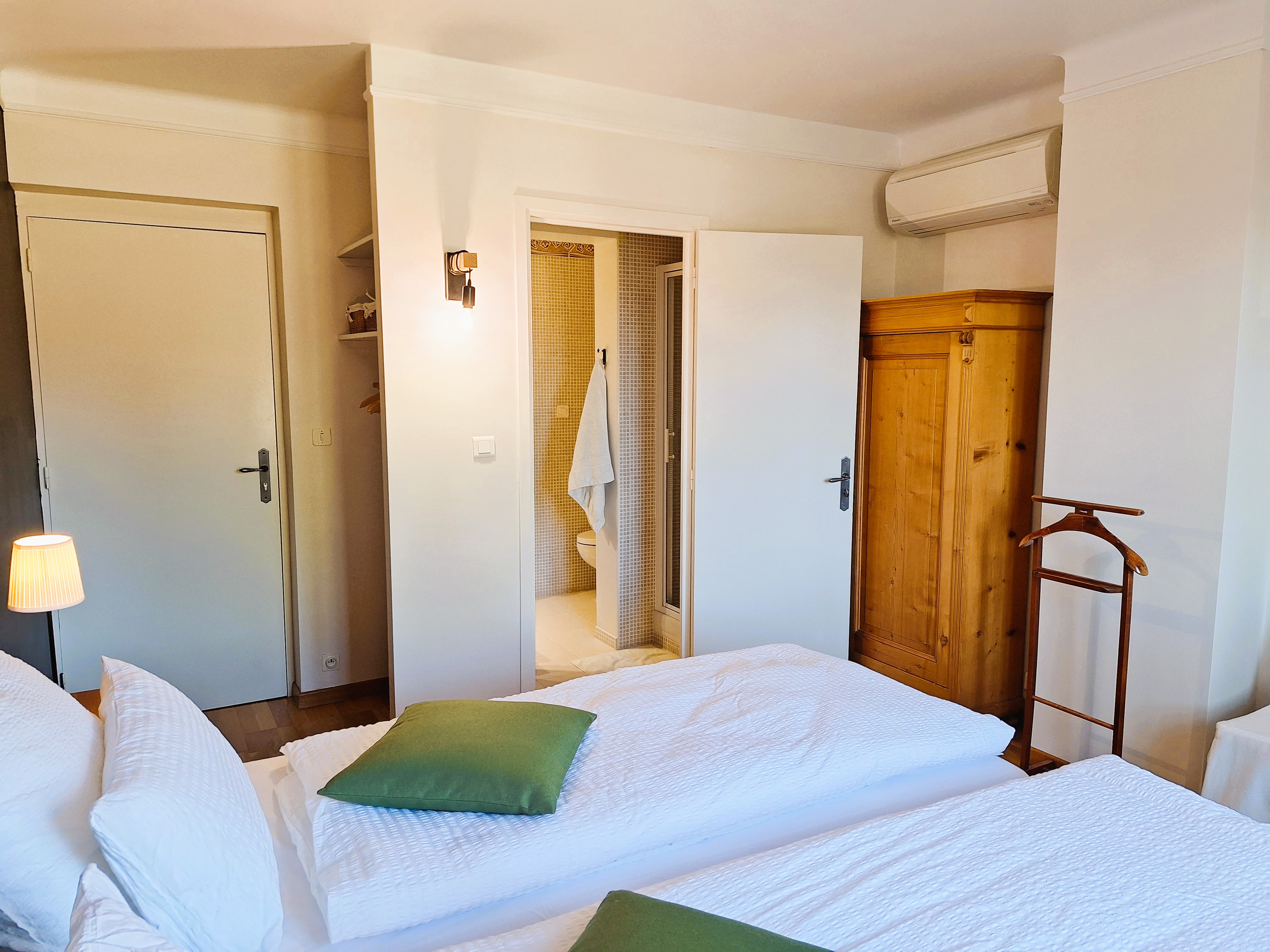 - Slaapkamer 6: tweepersoonsbed (180x220 cm) en twee eenpersoonsbedden 80x200cm), met aansluitende badkamer voorzien van dubbele lavabo, douche, bad en apart toilet. De slaapkamer heeft rechtstreekse toegang tot het terras bij het zwembad
